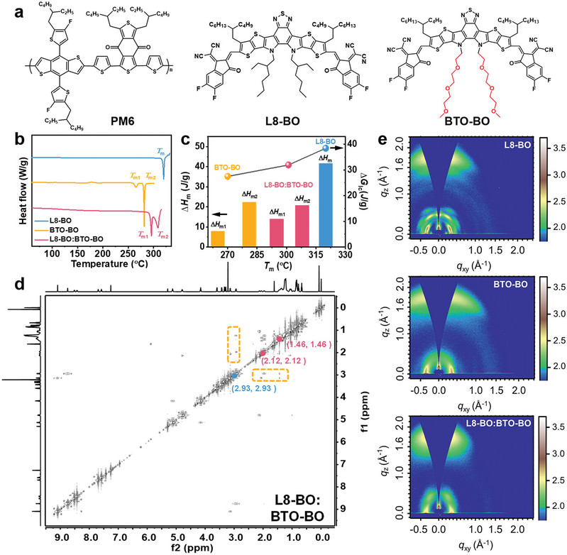 Abstract:High-boiling-point nonhalogenated solvents are superior solvents to produce large-area organic solar cells (OSCs) in industry because of their wide processing window and low toxicity; while, these solvents with slow evaporation kinetics will lead excessive aggregation of state-of-the-art small molecule acceptors (e.g. L8-BO), delivering serious efficiency losses. Here, a heterogeneous nucleating agent strategy is developed by grafting oligo (ethylene glycol) side-chains on L8-BO (BTO-BO). The formation energy of the obtained BTO-BO; while, changing from liquid in a solvent to a crystalline phase, is lower than that of L8-BO irrespective of the solvent type. When BTO-BO is added as the third component into the active layer (e.g. PM6:L8-BO), it easily assembles to form numerous seed crystals, which serve as nucleation sites to trigger heterogeneous nucleation and increase nucleation density of L8-BO through strong hydrogen bonding interactions even in high-boiling-point nonhalogenated solvents. Therefore, it can effectively suppress excessive aggregation during growth, achieving ideal phase-separation active layer with small domain sizes and high crystallinity. The resultant toluene-processed OSCs exhibit a record power conversion efficiency (PCE) of 19.42% (certificated 19.12%) with excellent operational stability. The strategy also has superior advantages in large-scale devices, showing a 15.03-cm2 module with a record PCE of 16.35% (certificated 15.97%).