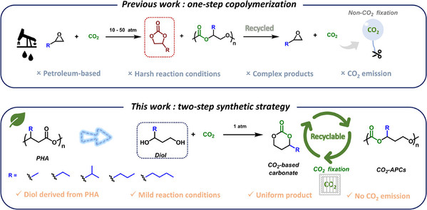 Abstract:Developing chemically recyclable polymers using CO2 and sustainable co-feedstocks is an important strategy for achieving carbon-neutral production of new polymers and mitigating plastic pollution. Herein, a series of six-membered cyclic carbonate monomers with different alkyl α-substituents were synthesized using CO2 and bioderived 1,3-alkanediol as raw materials at room temperature and atmospheric pressure. The organocatalytic ring-opening polymerization was systematically studied using a range of common and readily available organocatalysts. Phosphazene base (t-BuP2) was identified as the most effective catalyst, offering excellent control over the entire polymerization. The regioselectivity of the synthesized polycarbonates, ranged from 0.74 to 0.99, with the highest value achieved when the side group was isopropyl (highest steric hindrance). Notably, the α-substituent in the monomers reduced the ring strains, allowing the resulting polycarbonates to be fully recycled to the monomers without decarboxylation. The recycling process effectively traps CO2 in a closed loop between monomers and polymers, preventing its release into the atmosphere. The alkyl side groups enhanced the hydrophobicity of the polycarbonates, thereby reducing the likelihood of CO2 release through hydrolysis during their lifecycle, achieving a robust CO2 closed-loop fixation. The utility of CO2-based aliphatic polycarbonates as adhesives and the ability of copolymerization with l-lactide were explored.