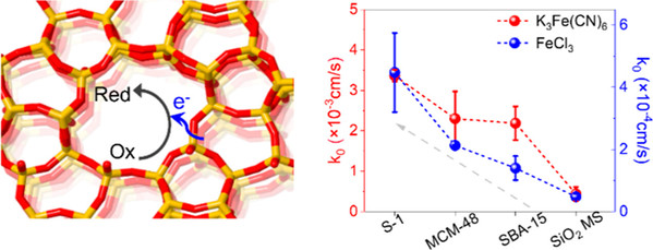 Abstract: To develop high-performance electrocatalysts is critical to sustainable conversion and storage of renewable energy. Silicalite-1 (S-1) zeolite is considered promising for constructing electrocatalysts featuring uniform and precise porosity and a stable structural skeleton even at extreme potentials. However, its electrochemical properties remain poorly understood, particularly regarding the roles of internal pore channels. Herein, inner- and outer-sphere electron transfer (ISET/OSET) routes on the S-1 zeolite were investigated by classical redox probes. The results for the first time revealed that the ISET kinetics inside the pores of S-1 zeolite is more rapid than that on external surfaces, optimized by microporous scale channels and terminated hydroxyl groups. Conversely, the kinetics of the OSET did not closely depend on the porosity and surface properties of the S-1 zeolite. These electrochemical insights further initiated a lithium-ion-incorporated S-1 zeolite with rapid ISET kinetics for electrocatalysis of oxygen reduction. It demonstrated a high performance of 85% selectivity for H2O2 production in a neutral solution and a yield of 9.2 mol gcat–1 h–1 when configured in a flow cell.