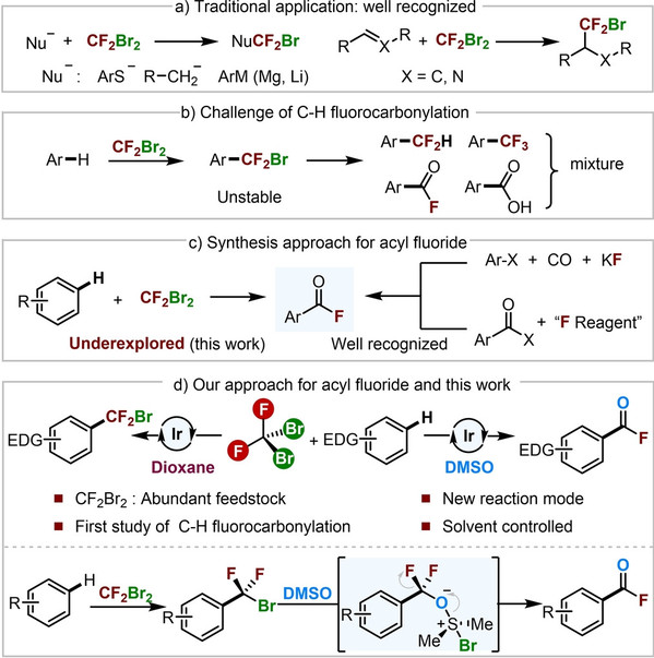 Abstract:The use of abundant and inexpensive fluorine feedstocks to synthesize fluorinated compounds is a promising strategy that has not been extensively investigated. Dibromodifluoromethane (CF2Br2) is an inexpensive fluorine source that has rarely been used for C−H fluoroalkylation. This study reveals an iridium-catalyzed, tunable strategy for synthesizing acyl fluorides and difluorobromomethylated products using CF2Br2. To achieve the desired products, this process only requires the change of solvent (from DMSO to 1,4-dioxane) under blue LED illumination. A variety of arenes and heteroarenes with electron-donating substituents were successfully used, yielding the corresponding products in moderate to good yields. Mechanistic experiments revealed that DMSO served a dual role, functioning as both solvent and nucleophilic reagent in C−H fluorocarbonylation.