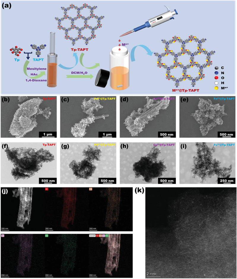 Abstract: Ring-opening of phenol in wastewater is the pivotal step in photocatalytic degradation. The highly selective generation of catalytical active species(•OH) to facilitate this process presents a significant scientific challenge.Therefore, a novel approach for designing photocatalysts with single-atom containment in metal-covalent organic frameworks (M-COFs) is proposed.The selection of imine-linked COFs containing abundant N and O-chelatesites provides a solid foundation for anchoring metal atom. These dispersed metal atom possess rapid accumulation and transfer capabilities for photogenerated electrons, while the periodic π-conjugated structure in 2D-COFs establishes an effective platform. Additionally, the Lewis acid properties of imine bonds in COFs can enhance the adsorption capacity toward gases with Lewis base properties, such as O2 and N2. It is demonstrated that the Pd2+@Tp-TAPT, designed based on this concept, exhibits efficient oxygen adsorption and follows the reaction pathway of O2→•O2−→H2O2→•OH with high selectivity, thereby achieving completely degradation of refractory phenol through photocatalysis within 10 min. It is anticipated that the selective generation of catalytic active species via advanced material design concepts will serve as a significant reference for achieving precise material catalysis in the future.