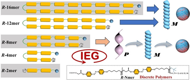 Abstract: Unraveling the chirality transfer mechanism of polymer assemblies and controlling their handedness is beneficial for exploring the origin of hierarchical chirality and developing smart materials with desired chiroptical activities. However, polydisperse polymers often lead to an ambiguous or statistical evaluation of the structure-property relationship, and it remains unclear how the iterative number of repeating units function in the helicity inversion of polymer assemblies. Herein, we report the macroscopic helicity and dynamic manipulation of the chiroptical activity of supramolecular assemblies from discrete azobenzene-containing oligomers (azooligomers), together with the helicity inversion and morphological transition achieved solely by changing the iterative chain lengths. The corresponding assemblies also differ from their polydisperse counterparts in terms of thermodynamic properties, chiroptical activities, and morphological control.