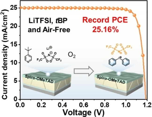 Abstract: To date, perovskite solar cells (pero-SCs) with doped 2,2',7,7'-tetrakis(N,N-di-p-methoxyphenylamine)-9,9'-spirobifluorene (Spiro-OMeTAD) hole transporting layers (HTLs) have shown the highest recorded power conversion efficiencies (PCEs). However, their commercialization is still impeded by poor device stability owing to the hygroscopic lithium bis(trifluoromethanesulfonyl)imide and volatile 4-tert-butylpyridine dopants as well as time-consuming oxidation in air. In this study, we explored a series of single-component iodonium initiators with strong oxidability and different electron delocalization properties to precisely manipulate the oxidation states of Spiro-OMeTAD without air assistance, and the oxidation mechanism was clearly understood. Iodine (III) in the diphenyliodonium cation (IP+) can accept a single electron from Spiro-OMeTAD and forms Spiro-OMeTAD•+ owing to its strong oxidability. Moreover, because of the coordination of the strongly delocalized TFSI- with Spiro-OMeTAD•+ in a stable radical complex, the resulting hole mobility was 30 times higher than that of pristine Spiro-OMeTAD. In addition, the IP-TFSI initiator facilitated the growth of a homogeneous and pinhole-free Spiro-OMeTAD film. The pero-SCs based on this oxidizing HTL showed excellent efficiencies of 25.16 % (certified: 24.85 % for 0.062-cm2) and 20.71 % for a 15.03-cm2 module as well as remarkable overall stability.