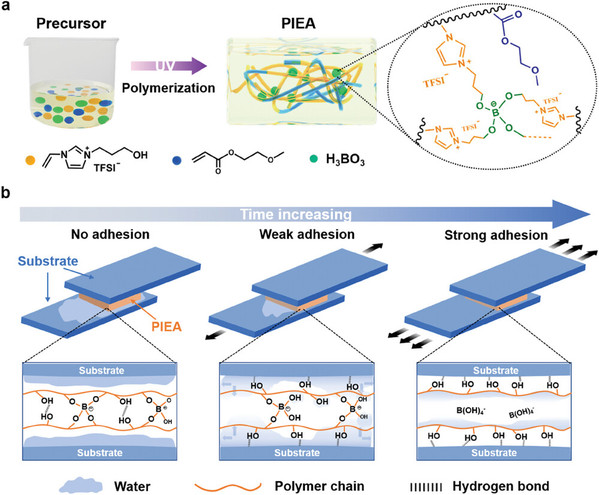 Abstract: Adhesion in aqueous environments is often hindered by the water layer on the surface of the substrate due to the water sensitivity of the adhesive, greatly limiting the application environment. Here, a borate ester dynamically crosslinked poly(ionic liquid) elastomer adhesive (PIEA) with high strength, toughness, self-healing abilities, and ionic conductivity is synthesized by copolymerizing hydrophobic ionic liquid monomer ([HPVIm][TFSI]) and 2-methoxyethyl acrylate (MEA). The adhesion strength of PIEA can increase spontaneously from almost no adhesion to 314 kPa after 12 h without any external preloading due to the dissociation of the borate ester in water, leading to noncovalent interactions between the hydroxyl groups of PIEA and the substrate. Additionally, PIEA can be developed for soft sensors or ion electrodes to enable underwater detection and communication. This strategy offers broad application potential for the development of novel underwater smart adhesives.
