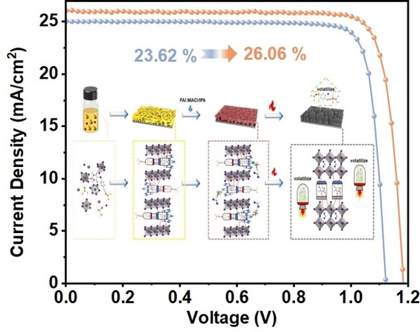 Abstract:The rapid reaction between lead iodide (PbI2) and formamidinium iodide (FAI) complicates the fabrication of high-quality formamidinium lead iodide (FAPbI3) films. Conventional methods, such as using nonvolatile small molecular additives to slow the reaction, often result in buried interfacial voids and molecule diffusion, compromising the devices’ operational stability. In this study, we introduced a molecular “thruster”—a hypervalent iodine (III) compound with three carbonyl groups and a C−I+ bond—that possesses coordination and dissociation abilities, enabling programed modulation of perovskite-film growth kinetics. Initially, the three carbonyl groups coordinate with PbI2 to slow the reaction between FAI and PbI2, preventing δ-phase formation. As temperature rises, the C−I+ bond dissociates, promoting perovskite growth and the dissociated product iodobenzene will promote solvent volatilization, thus avoiding buried interfacial voids. Another product, a carbene compound with eight lone pair electrons sufficiently passivate the undercoordinated Pb2+ defects and anchors at grain boundaries without diffusion. Consequently, the resultant FAPbI3 film displays high-quality with enhanced phase purity, compact morphology, and reduced defects. Evidently, 0.062- and 1.004-cm2 pero-SCs achieve power conversion efficiencies (PCEs) of up to 26.06 % (25.79 % certified) and 24.65 %, respectively. This approach also controls perovskite-film growth on plastic substrates, resulting in flexible pero-SCs with an impressive PCE of 25.12 %.
