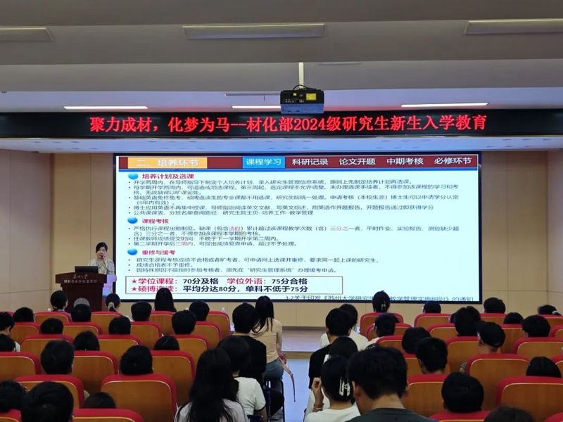 材料与化学化工学部在907-1101以“聚力成材,化梦为马”为主题,举行了研究生新生入学教育系列讲座。讲座包括研究生培养工作介绍、学位申请规章制度解读、研究生日常管理、奖助学金政策解读、实验室安全教育以及党团组织建设等内容,从科研、奖助、生活等方面为培养研究生全面成长成才助力。
