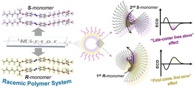 Abstract: Any polymers composed of racemic segmentsare obviously optically inactive and lack any chiropticalapplications. Here, we present an intriguing method forprecisely generating global chirality in racemic copolymer assemblies without any external asymmetricalintervention via step-wise polymerization-induced chiralself-assembly (PICSA). Global supramolecular chiralityof the nanoaggregates could be dynamically switched bythe two diametrically opposed chiral conflict effects:“first come, first serve” effect and “late-comer livesabove” effect, which can be controlled by the preciselyspecified the number and sequence of enantiomericsegments. Significantly, the supramolecular stackingmanners of the racemic mesogenic building units as wellas the liquid crystallinity of the solvophobic core play acrucial role for the chiral communication pathway ofenantiomeric mesogens. Furthermore, such switchableglobal chirality in racemic polymers is broadly applicableand well regulable. We propose that this research maychallenge the notion that racemic systems lack opticalactivity while highlighting their potential applications infunctional racemic polymer materials and providinginsights into the evolution of racemates towards homochirality on early Earth.