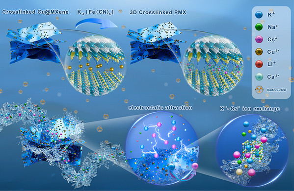 Abstract: Selective enrichment of cesium ions (Cs+) at ultralow concentrations is essential for resource recovery and radioactive waste disposal, yet efficient adsorbents are lacking. Herein, we reported a Prussian blue analogue (K2Cu3(Fe(CN)6)2, Cu-PBA) decorated on MXene nanosheets by in situ fabrication, forming a composite material termed PMX, for enhanced adsorption of Cs+ in acidic solutions and seawater. The stable, negatively charged MXene effectively anchors Cu2+ precursors and promotes Cs+ adsorption. The synergistic interaction between MXene and the in situ-synthesized Cu-PBA significantly enhances the adsorption performance and water stability of PMX in both acidic solutions and seawater. PMX achieves rapid adsorption equilibrium within 5 min, with a high adsorption capacity of 408.2 mg/g at pH 1, surpassing conventional adsorbents. Moreover, PMX shows excellent Cs+ selectivity (Kd= 68,361.7 mL/g), cycle stability, and notable anti-irradiation ability, demonstrating superior efficiency in Cs+ enrichment from complex matrices. The adsorption mechanism involves electrostatic attraction and K+/Cs+ ion exchange, facilitated by MXene’s functional groups and the Cu-PBA structure. These findings underscore the excellent potential of PMX as an efficient adsorbent for resource enrichment and the removal of radioactive elements such as Cs+.