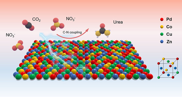 Abstract:Electrochemical urea synthesis via the coreduction of CO2 and NO3– is a sustainable alternative to the traditional Bosch–Meiser process. However, the sluggish reaction kinetics usually result in a low efficiency. Herein, we designed a kind of quaternary PdCuCoZn medium-entropy alloy (MEA) metallene for highly selective urea electrosynthesis. The random occupation of Cu, Co, and Zn with lower electronegativity in the face-centered cubic lattice of Pd-based metallene enables abundant electron donation from transition metals to adjacent Pd atoms, leading to the formation of charge-polarized Pdδ−–Cu/Co/Znδ+ sites. Considering that the pivotal C- and N-intermediates, namely, *CO and *NH2, are electrophilic and nucleophilic, respectively, such strong charge polarization would greatly benefit their respective formation and stabilization. The stable adsorption with *CO bonded to electron-rich Pd-based sites and *NH2 bonded to electron-deficient Cu/Co/Zn-based sites is demonstrated by the combination of in situ characterizations and theoretical calculations. The proof-of-concept PdCuCoZn MEA metallene achieves a maximum urea yield rate of 1840 μg h–1 mg–1 and a high Faradaic efficiency of 70.2%, surpassing most of the reported state-of-the-arts. Our strategy proposed in this work is believed to enlighten the design of an effective catalyst used for multistep reactions.