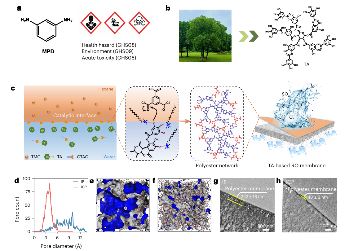 图: 以单宁酸为单体的聚酯反渗透膜的制备过程示意图及结构表征
