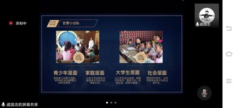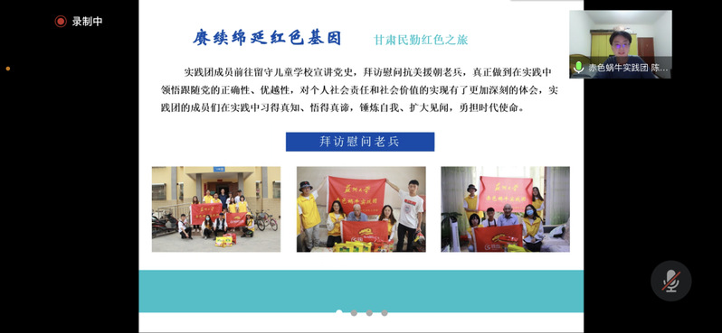 赤色蜗牛实践团的负责人陈明智叙述了团队在常州采菱社区以及甘肃民勤的实践情况。致力于基层党建,团队通过走访社区居委会学习红色思想,通过义教向留守儿童传播红色思想,做到将文化输入转为文化输出。