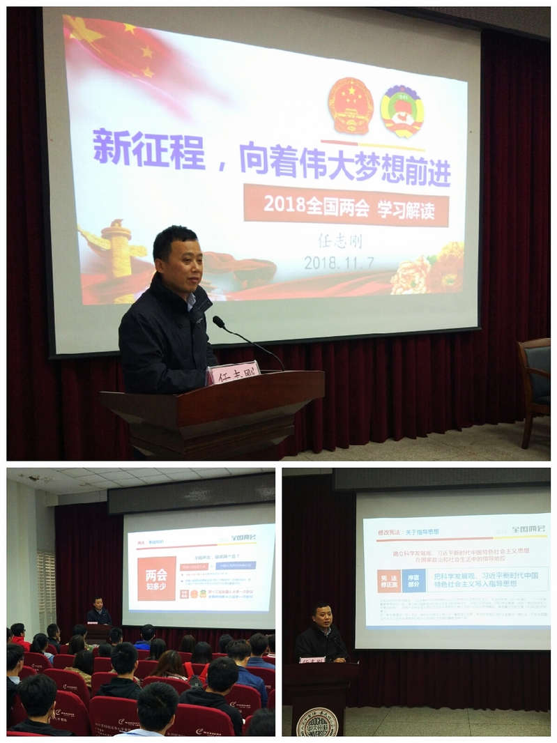 此次讲座任志刚老师以《新征程,向着伟大梦想前进》为主题,从今年两会的召开引入主题,解读两会,让我们对党有了更多的了解。任老师从两会的基础知识、主要任务、主要议程等方面介绍了两会的新起点,强调了今年是两会与“以往不同”的换届之年,在时间节点和重大任务等方面有着十分重要意义;通过两会的六大看点详细介绍了此次两会的新看点;从教育、环境、消费、安全等方面介绍了新时期民生福利的新目标,这都体现了党全心全意为人民服务的宗旨;同时还从修改宪法、反腐和国务院机构改革方面阐述了两会精神。