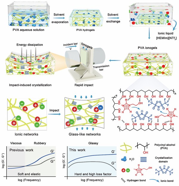 Abstract: Solvents within gels enhance the mobility of polymer chain segments while concurrently diminishing interchain interactions, thereby facilitating the ductility of glassy polymers at the cost of their mechanical strength. Here, we develop a solvent toughening strategy for the preparation of highly compressible and high-strength ionogels in the glassy state. This approach leverages the synergistic effects of the slow dissociation-shift kinetics of solvent ionic liquids and polymer crystallization. Ionogels exhibit an ultimate compressive stress of 2.3 GPa (at 98% compressive strain), toughness of 1219.3 MJ m−3, and energy dissipation rate of 81.9% (at 70% compression strain). The highly interacting ionic bondsofsolvent and the fast crystallization of polymers under load toughen the ionogels and confer impact hardening and efficient energy dissipation behavior under fast impact. A 500-μm-thick ionogel coating can protect fragile items, such as glass, from impact damage. Ionogels, renowned for their impact resistance, hold promise for various applications across industries including human body implants, equipment, transportation, and aerospace.