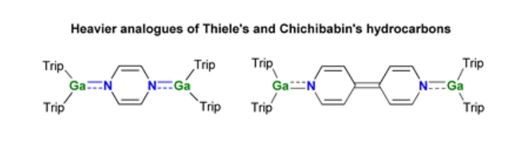 Abstract: Treatment of two equivalents of Trip2GaCl (Trip = 2,4,6-triisopropylphenyl) with pyrazine and 4,4′-bipyridine affords adducts 1 and 2 in high yields. The two-electron reduction of 1 and 2 using potassium graphite readily gives rise to the first GaN-based analogues of Thiele's and Chichibabin's hydrocarbons, Trip2Ga(C4N2H4)GaTrip2 (3) and Trip2Ga(C10N2H8)GaTrip2 (4), respectively, as crystalline solids. Structural analysis and DFT calculations suggest a closed–shell singlet ground state for both 3 and 4.