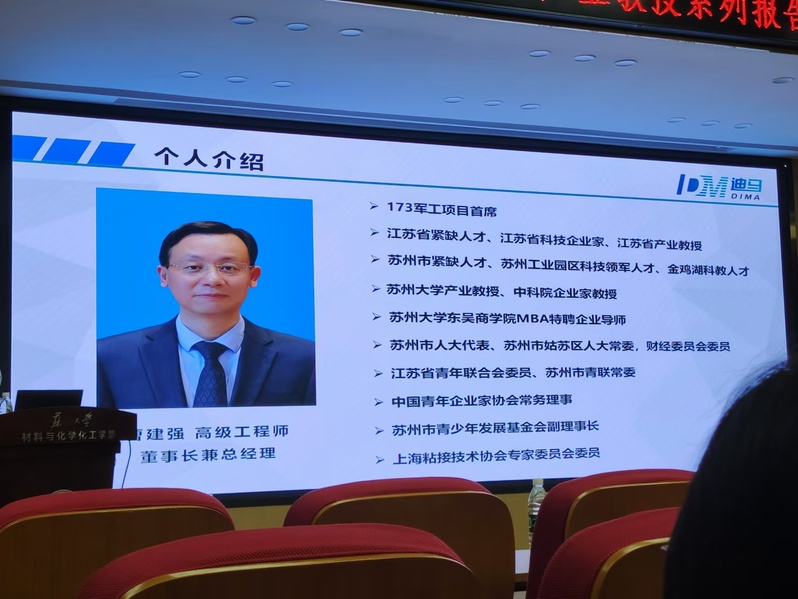 首场讲座题为《从进口依赖到自主创新——展望新材料行业的职业前景》,由迪马新材料科技(苏州)有限公司董事长、江苏省产业教授曹建强主讲。