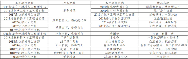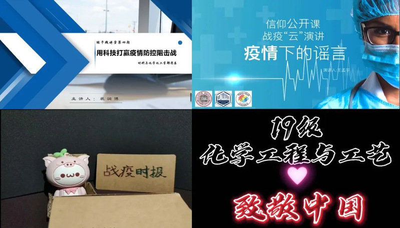 此次线上信仰公开课活动中,材化部共有27个基层团支部和学生组织开展了线上信仰公开课。每一个公开课视频都凝聚了材化学子对疫情的关注、对这场抗疫战争胜利的期待。学部团委组织评议小组遴选了3件优秀作品上报校团委。