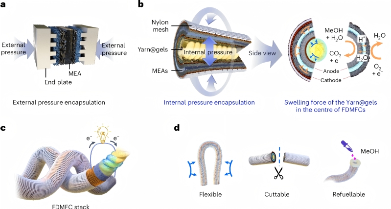 该成果创新性报道了一种凝胶介导的内压力封装技术,并成功用于柔性纤维状燃料电池的制备。研究团队巧妙利用凝胶纤维在吸收甲醇(燃料)过程中展现的动态膨胀特性,提出了一套自适应内压力封装策略,最终高效制备出性能优异的纤维状甲醇燃料电池。所制备的柔性燃料电池具备突出的环境适应性与实用性能:可在- 22至70℃的宽温度区间内稳定运行;兼具可裁剪性、防水性与快速燃料补给能力;经2000次大角度弯曲循环测试后,仍能保持稳定的放电性能。该成果为解决当前燃料电池及燃料电池堆在轻量化、柔性化发展中面临的核心难题提供了具有价值的有效解决方案,对推动柔性能源器件的产业化应用具有重要意义。