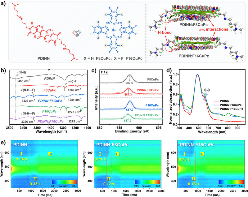 Abstract: The capability of cathode interlayer (CIL) in regulating the conductivity, interfacial dipole, and work function of the electrode plays a critical role in determining the photovoltaic performance of organic solar cells (OSCs). The widely used perylene-diimide-based CILs suffered from the inbuilt limitation of finite conductivity and poor thickness tolerance. To address this issue, we develop a universal strategy to finely optimize the functionality of perylene-diimide-type CIL (PDINN) by incorporating polyfluorine-substituted copper phthalocyanine (CuPc) derivative to form a hybrid CIL. It is found that the hydrogen bonding and π–π interaction between PDINN and CuPc can address the solvent processability issue of CuPc used as CIL. The incorporation of CuPc in the PDINN layer leads to better film morphology, increased conductivity, and reduced cathode work function, enabling greater CIL thickness tolerance and significantly improved photovoltaic performance of OSCs. Notably, the PM6:D18:L8-BO-based device using PDINN:F16CuPc as hybrid CIL yields a remarkable power conversion efficiency (PCE) of 20.17%, which is a significant improvement with regard to the PCE of 19.29% for the control device based on PDINN CIL. Particularly, this strategy demonstrates a universality in multiple photoactive layers and various perylene-diimide-based CILs, offering an effective approach to developing highly efficient OSCs.