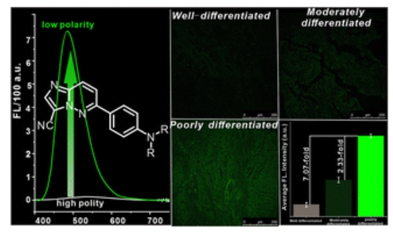 Abstract:Two polarity-responsive probes,1a and1b, were prepared via Suzuki coupling. These probes targeted mitochondria and lipid droplets, respectively, enabling the monitoring of polarity changes. Probes1a and1b could indicate the difference between lung cancer tissues with different degrees of cellular differentiation, exhibiting fluorescence intensities that were 6.9–7.3-fold and 2.3–2.5-fold higher in poorly differentiated tissues than in highly and moderately differentiated tissues, respectively.
