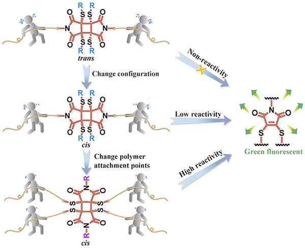 Abstract: Mechanoluminescent polymers based on mechanophores have gained significant interest due to their prospective applications in electronic skin, smart screens, and anticounterfeiting devices. Despite the progress made, there remains a demand for stable mechanophores that offer tunable reactivities. Herein, we report a novel dithiomaleimide (DTM) dimer mechanophore that undergoes a cycloreversion reaction to afford fluorescent DTM under mechanical force. Upon incorporation into poly(methyl acrylate) (PMA) and polyurethane, the DTM dimer shows mechanochemical reactivity in both solution and bulk states. Notably, the mechanophore with polymers directly attached to the four-membered ring displays enhanced reactivity, and the cis-configuration of the mechanophore is more beneficial to its activation than the trans-configuration. Additionally, the fluorescence intensity of the mechanophore is found to be positively correlated with the magnitude and duration of the applied mechanical force. The iterative activation of the mechanophores can be achieved by multiple compression cycles. Our study reveals the importance of structural design in enhancing the mechanochemical behavior of mechanophores and offers valuable insights for the development of mechanoresponsive materials with tunable reactivities.