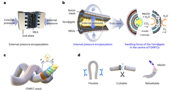 Abstract: The development of flexible fuel cells has been hindered by the rigid components and stringent requirements for pressure encapsulation and fuel sealing. Here we report an adaptive internal pressure encapsulation strategy that leverages the dynamic swelling behaviour of woven cotton fibres enclosed in a gel matrix in methanol. This strategy achieves simultaneous interfacial self-reinforcement and pressure modulation, enabling the fabrication of fibre-shaped direct methanol fuel cells. These flexible fuel cells operate across a broad temperature range, from –22 °C to 70 °C, showcasing cuttability, water resistance and fast refuelling capabilities, with full refuelling being achieved within 1 min. Furthermore, the fuel cells maintain consistent discharge performance, even after enduring 2,000 continuous flexing cycles. With an energy density of 161.36 Wh kg−1, these fibre-shaped direct methanol fuel cells surpass the energy densities of typical fibre-based power systems. This technology mitigates many of the technical challenges related to the lightweight and flexible application of fuel cells or fuel cell stacks for powering high-energy flexible devices.