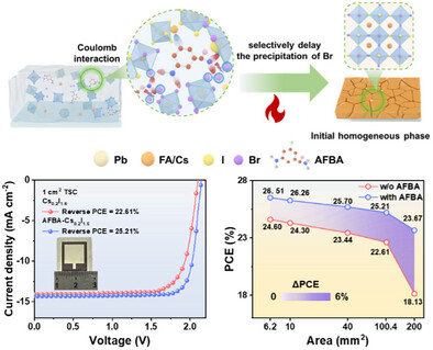 Abstract: Mixed halide wide-bandgap (WBG) perovskites, used in high-performance perovskite/organic tandem solar cells (TSCs), are prone to phase segregation under light irradiation. Particularly, the initial inhomogeneous halide phase distribution in WBG perovskites can accelerate the phase segregation under operational stressors, thus hindering scaling of TSCs that require high phase homogeneity. Here, a selective delayed crystallization strategy is proposed in which a functional agent (3-amino-5-fluorobenzamide; AFBA) is used to regulate the initial halide phase distribution. The -NH2 of AFBA, with a low electron-cloud density, shows a higher binding affinity with bromide than with iodide, thus selectively delaying the rapid crystallization of bromide; this phenomenon induces a homogeneous halide distribution across the film. The initial homogeneous film is phase-stable under operational stressors. As a result, the square-centimeter WBG perovskite front cell achieves a high efficiency of 18.61%. When stacked with organic subcells, the square-centimeter perovskite/organic TSC exhibits a remarkable efficiency of 25.21%, showing a weak-dependence of efficiency on size from 0.062 to 2.000 cm2, as well as a prolonged operational lifetime with a T90 of 1500 h. Perovskite/organic TSCs are also connected in series with electrochromic devices to dynamically monitor the TSC performance via the color variation, providing insights for their future applications.