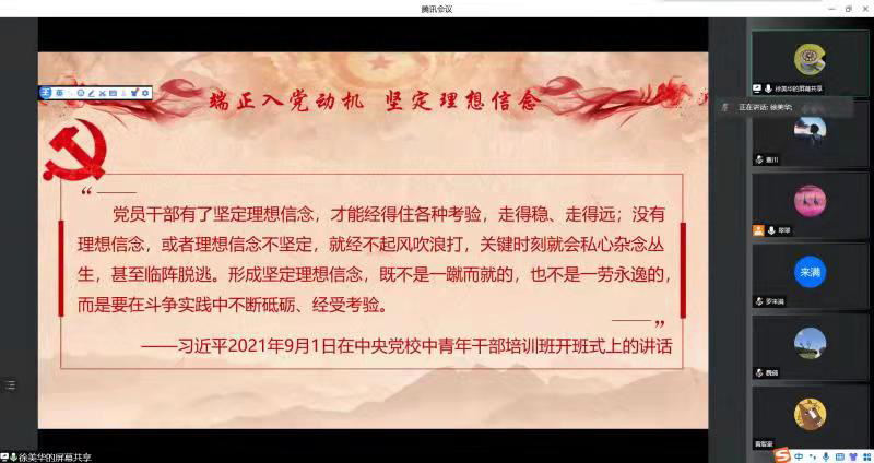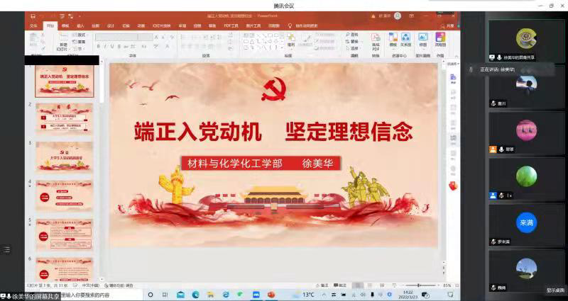 3月23日星期三下午,B站视频 材料与化学化工学部党校开班典礼在腾讯会议线上进行。学部党委书记李翔,党委副书记 、副主任徐美华,纪委书记李乐,党委群工委员、工会主席任志刚,学部教师代表以及第46期预备党员和第67期入党积极分子全体学员参加了本次典礼。本次开班典礼由专职组织员李映杏主持。