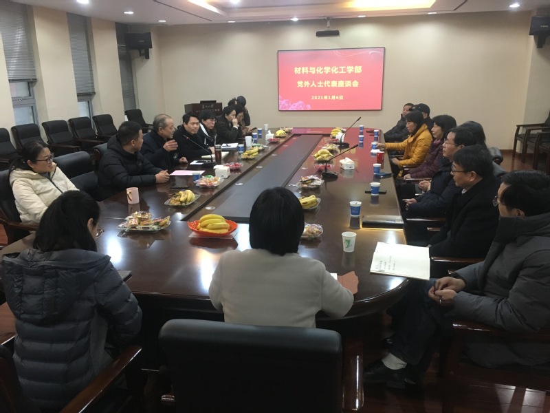 2021年1月6日下午,材料与化学化工学部在907号楼1222会议室召开了党外人士代表座谈会,学部党委李翔书记、王美珠副书记、纪委李乐书记、学部党委群工委员任志刚、组织委员司马文华、学部综合办蔡琪主任、团委副书记鲍清老师、学部各民主党派、群众团体的代表参加了会议,会议由学部党委统战委员沈勤副主任主持。