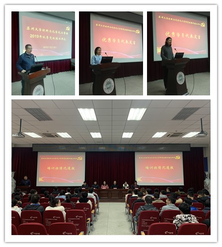在2019年秋季党校培训中,第41期预备党员培训班共培训学员20名,其中研究生8名,本科生12名;第62期党的基础知识培训班共培训学员56名,其中教工1名,研究生10名,本科生45名。本学期,学部分党校邀请学校党校讲师团田芝健、黄建洪两位专家先后开设了2次示范党课,分别为《中国共产党章程与党的建设》、《推进国家治理现代化的里程碑——党的十九届四中全会精神解读》,组织了4次专题党课,分别为《党性荣耀:初心、使命》、《提高党性觉悟,争做合格党员》、《新时期党员如何发挥先锋模范作用》、《用心育心 师生共成长》。分党校严格执行考勤制度,与金鸡湖商务区机关及事业单位第七党支部开展共建活动,共组织170余人次进行金鸡湖小水滴环保志愿服务;组织集中观看电影《我和我的祖国》及《我和我的祖国》千人交响音乐会,组织参观“江苏省庆祝中华人民共和国成立70周成就展”,集中观看央视《榜样4》节目并开展座谈会,组织党员上网参观 “伟大历程 辉煌成就——庆祝中华人民共和国成立70周年大型成就展”网上展馆等;分组开展读书活动,阅读了《习近平的七年知青岁月》、《激荡十年,水大鱼大》、《马克思传》、《苦难辉煌》、《世界大格局中国有态度》、《大国战略》、《红星照耀中国》、《中国为什么有前途》等书籍,并组织了8场读书分享会交流心得;分成8个小组进行专题讨论,交流党校学习心得,取得了良好的效果。