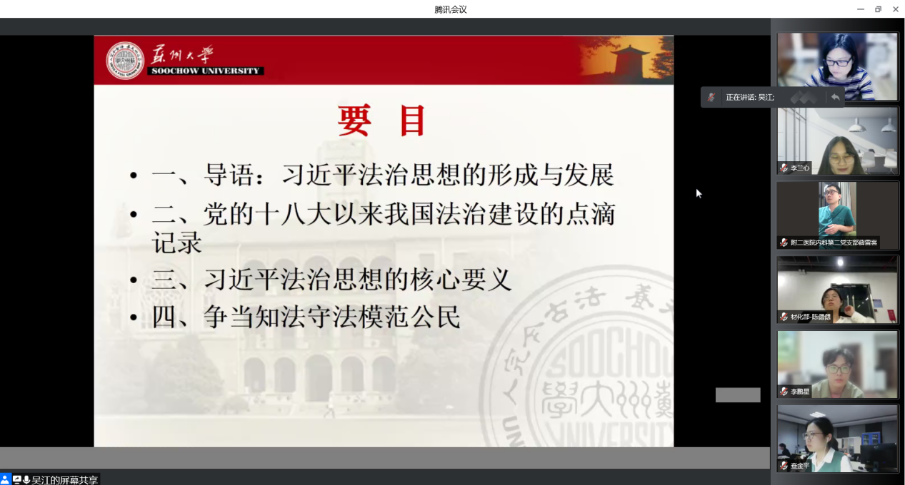吴江以“深学笃行习近平法治思想,争当知法守法模范公民”为题,分别从习近平法治思想的形成与发展、党的十八大以来我国法治建设的点滴记录、习近平法治思想的核心要义、争当知法守法模范公民四个方面进行了介绍和讲解。