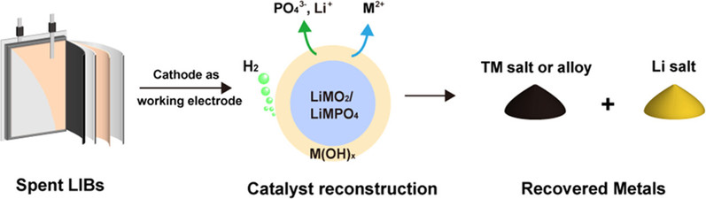Abstract: Mass adoption of electric vehicles and the depletion of finite metal resources make it imperative to recycle lithium-ion batteries (LIBs). However, current recycling routes of pyrometallurgy and hydrometallurgy are mainly developed for LiCoO2 and suffer from great energy inputs and extensive processing; thus, alternative versatile and green approaches are in urgent demand. Here, we report an ingenious and versatile strategy for recycling LIBs via catalyst reconstruction, using hydrogen evolution reaction as a proof of concept. Layered, spinel, and polyanion oxide cathode materials, as catalysts, are structurally transformed into hydroxides assisted by protons or hydroxide ions, facilitating complete metal extraction (e.g., Li, Co, Ni, Mn, Fe) with high leaching efficiencies approaching 100%. This recycling method is generally applicable to almost all commercial cathode systems and extended to actual spent pouch cells. Such a green hydrogen coupling approach provides a versatile and sustainable alternative to conventional approaches and has a broad impact beyond battery recycling.