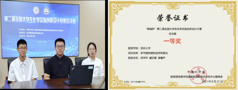 在两个月的决赛备战期间,孙宏枚和赵蓓老师指导的参赛团队成员放弃了暑假休息,根据专家的点评意见继续对参赛作品进行了系统而全面的优化。在全国总决赛中,三位同学齐心协力、沉着答辩,最终获得了全国总决赛一等奖的佳绩,展现了苏大本科生的风采。此次竞赛获奖也充分体现了材化部一贯高度重视本科教学,大力倡导“科研反哺教学”,切实践行“培养具有严谨求实的科学态度,实验技能精湛,具备创新思维能力和实际问题解决能力的创新人才”的教学理念。