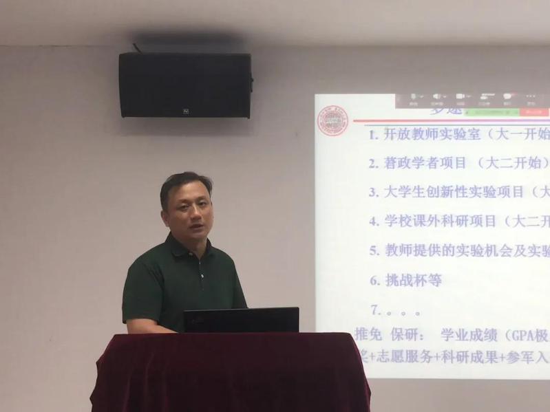 接着,张主任介绍了材化部在本科、硕士和博士人才培养过程中的特色工作。他详细介绍了本科强化班、拔尖班、以及本硕博一体化的培养流程,并勉励新生们努力学习,力争上游。同时,他还提到了材化部的学科内交叉融合机制,鼓励同学们利用学部现有平台和资源,创造性地开展学习和科研,为国家“双碳”重大战略贡献自己的力量。