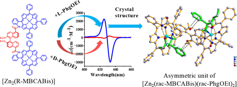 Abstract: Chiral discrimination of amino acid stereoisomers is essential for biological processes and pharmaceutical development. Bisporphyrins represent promising candidates for the chiral recognition of amino acid derivatives. Herein, we report a rationally designed binaphthyl-linked zinc bisporphyrinate complex demonstrating remarkable enantioselective binding toward l-phenylglycine ethyl ester (L-PhgOEt). The complex demonstrates a 19-fold amplification in circular dichroism (CD) response intensity for L-PhgOEt over its d-enantiomer, with quantified enantioselectivity (L/D = 4.8), reflecting good chiral recognition capabilities. Single-crystal X-ray analysis unveils a multimodal recognition mechanism involving (i) axial coordination to zinc centers, (ii) hydrogen bonding interactions with amide functionalities, and (iii) π-system stabilization through both C–H···π and O···π interactions with the methoxy-functionalized binaphthyl linker. This synergistic combination of coordination bonds and noncovalent interactions establishes bisporphyrins as tailorable chiral receptors and guides the design of biomimetic systems for pharmaceutical applications.