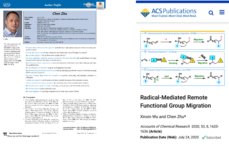 近日,朱晨教授再次接受国际化学顶级综述刊物《Acc. Chem. Res.》邀请,为“远端官能团迁移”化学撰写综述(Acc. Chem. Res. 2020, 53, 1620)。