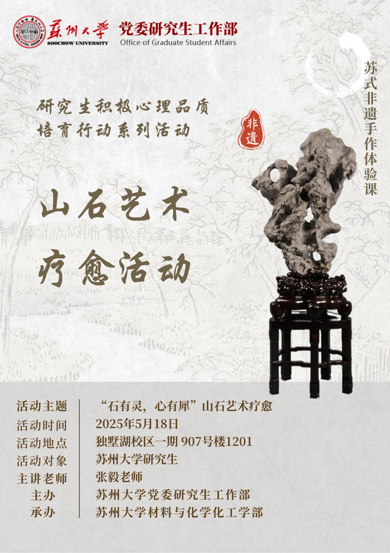 学部将于5月18日开展“石有灵,心有犀”山石艺术疗愈活动,特邀苏州山石艺术非遗传承人张毅现场指导,带领大家走进赏石加工技艺,感受自然的鬼斧神工,体悟艺术的匠心独具。