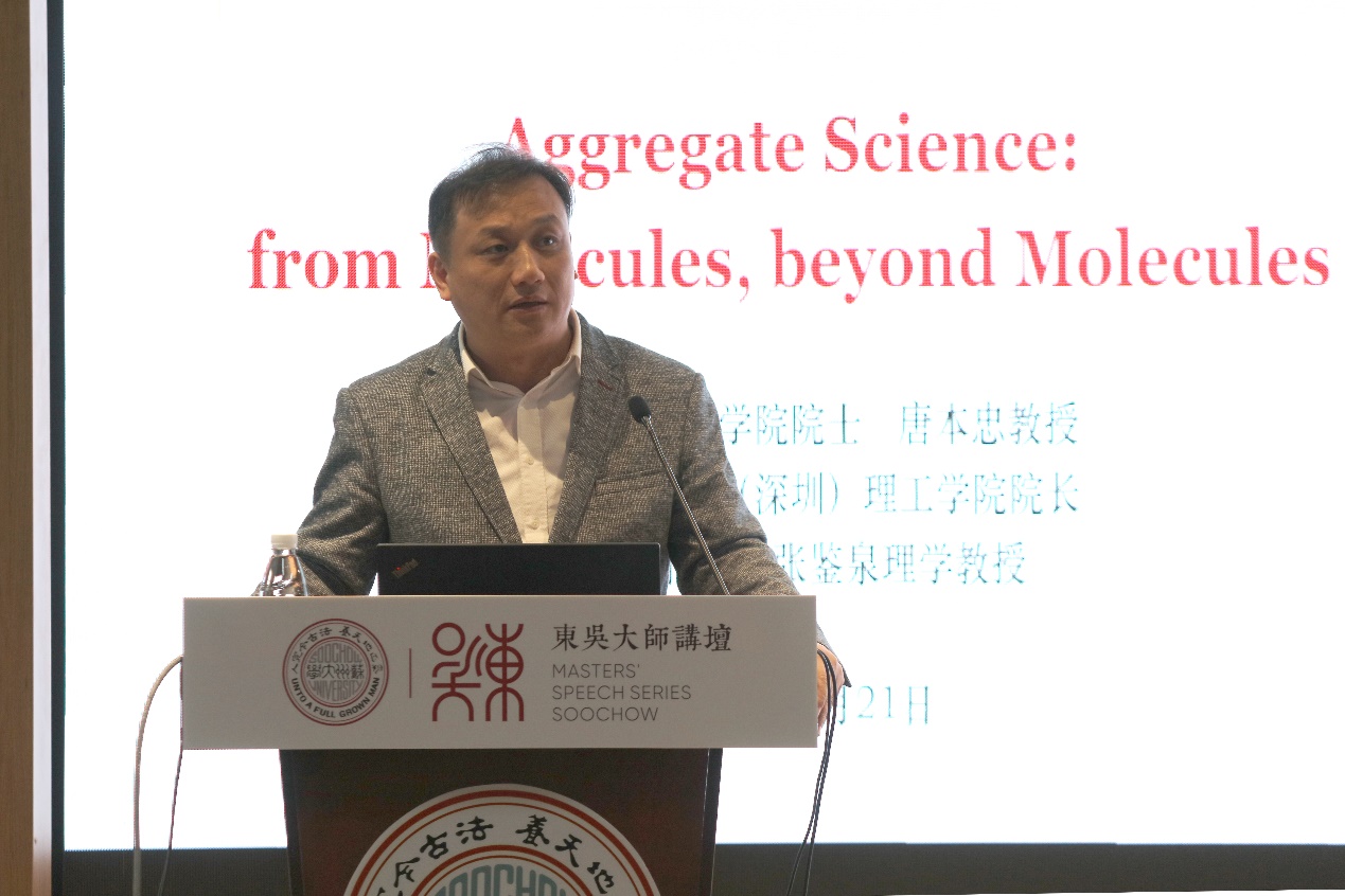 10月21日下午,“东吴大师讲坛”第八讲在独墅湖校区医学楼4楼学术报告厅举行。中国科学院院士、香港中文大学(深圳)理工学院院长、香港科技大学张鉴泉理学教授唐本忠教授应邀带来题为“Aggregate Science: from Molecules, beyond Molecules”的报告,数百名师生共同聆听了精彩报告。讲座由材料与化学化工学部主任张正彪教授主持。