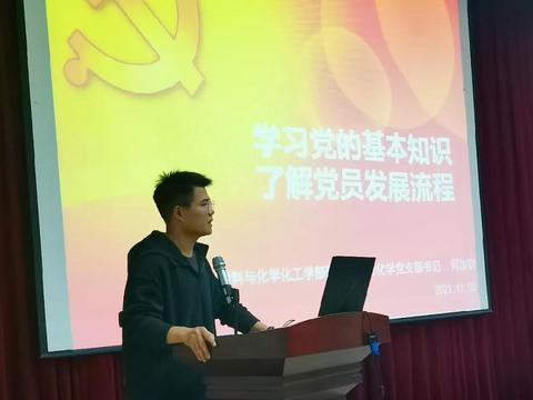 首先,材化部研究生应用化学党支部书记何加钦博士向新生们讲解了入党的流程,让同学们知道在党员发展过程中,如何端正入党动机,如何积极向党组织靠拢,让新递交入党申请书的同学,对党员发展的基本流程有所了解。