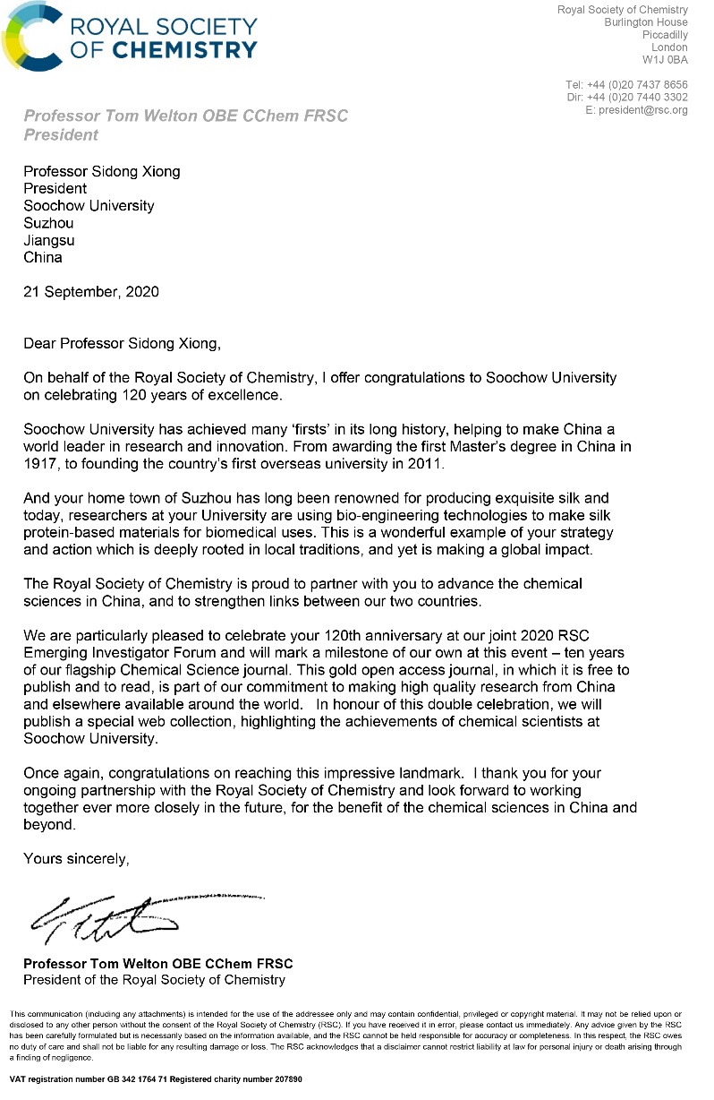 为庆祝B站视频 120周年校庆以及英国皇家化学会旗舰期刊Chemical Science创刊十周年,英国皇家化学会主席Tom Welton先生特致信B站视频 校长熊思东以示祝贺。