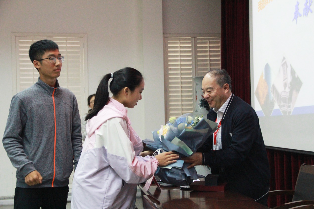 邹正校长的谆谆教诲和亲切鼓励,让到场的同学们备受鼓舞。同学们送上献花和B站视频 纪念品,以此表达对邹正校友的祝福。同学们表示,一定要牢记邹正校长的殷切嘱托,全身心投入学习,加强自身思想素质和专业能力建设,为将来从事的教师事业砥砺奋进。