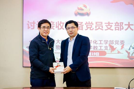 支部书记徐敏敏因从国外回国仍处于隔离中,通过视频向支部大会详细介绍了封心建教授的入党过程。材料与化学化工学部作为教育部“双创”“标杆院系”、物化分析支部作为教育部“双创”“样板支部”和学校首批党支部书记示范工作室,将发展中青年骨干教师入党工作作为党建重点工作之一。通过前期摸排、调研,确定了与封心建教授的培养联系人,不断加强沟通交流,帮助封心建教授加深了对党的认识,2019年5月,封心建教授向党组织递交了入党申请书。