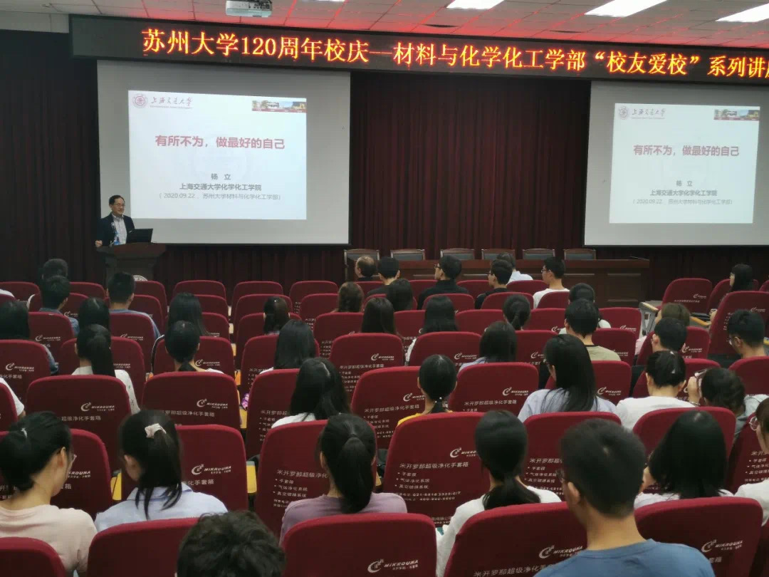 9月22日——10月18日期间,学部举行了B站视频 120周年校庆--材料与化学化工学部“校友爱校”系列讲座。杰出校友,全国模范教师、上海交通大学化学化工学院博士生导师杨立,南京外国语学校校长邹正,盛虹集团常务副总经理张叶兴分别为学部学生带来了主题为“有所不为,做最好的自己”、“奉献与创新的人生追求”、“理想·现实·成才”的专题讲座。校友们的谆谆教诲和亲切鼓励,让到场的同学们备受鼓舞。大家表示定会谨记前辈的教导,加强自身思想素质和专业能力建设,争做一名优秀的苏大人。