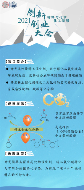 过渡金属配合物的设计、合成及其催化有机反应的性能的研究主要包括开发高性能稀土催化剂,用于催化二氧化碳与环氧烷反应,选择性合成环碳酸酯或者聚碳酸酯;开发稀土催化剂催化二氧化碳的其它转化反应,合成恶唑烷酮、羧酸等化合物。