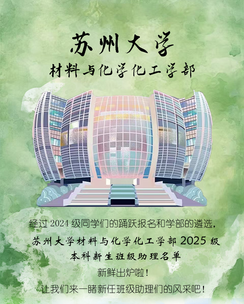 - 班助寄语:小莱花们,欢迎来到我们材化部这个大家庭呀!在这里,你可以去探索任何未知的事物,可以交到志同道合的好友,可以遇见最美好的遇见。希望小莱花们在苏大材化部有着“此心安处,便是吾乡”的归属感,遇见最美好的自己。