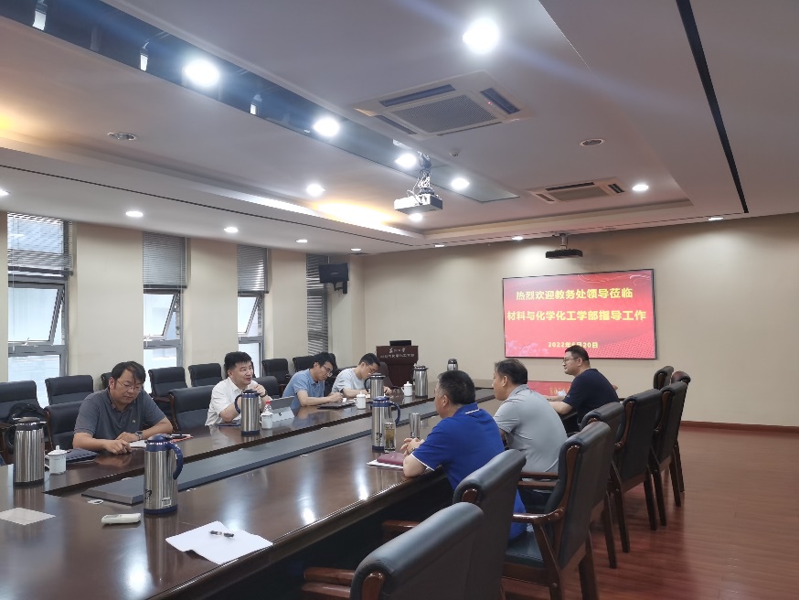2022年6月20日,教务处处长方亮来至材化部调研,指导本科教学工作。副处长陈忻华,课程与考试课科长许凯,副科长沈晓卫陪同调研。材化部主任张正彪,副主任姚英明,主任助理徐敏敏,教务秘书曹小倩参加会议。会议由材化部主任张正彪主持。