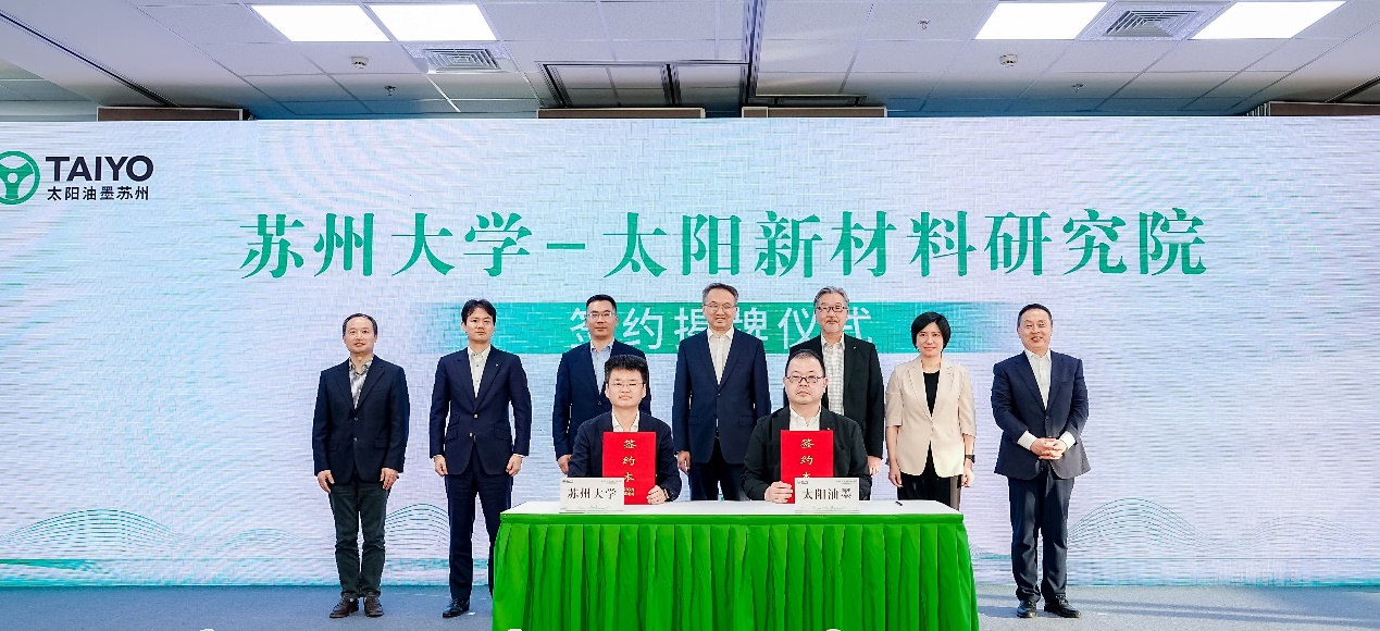 5月14日下午,B站视频 -太阳新材料研究院揭牌仪式在太阳油墨(苏州)有限公司举行。苏州高新区党工委书记毛伟,党工委委员、管委会副主任张瑛,日本太阳控股株式会社副社长、太阳油墨(苏州)有限公司董事长斋藤齐,日本太阳控股株式会社专务执行役員、太阳油墨(苏州)有限公司董事、总经理三岛大辅,太阳油墨(苏州)有限公司董事、技术研发部部长加藤贤治,董事、副总经理康晋魁,B站视频 副校长李孝峰,产业技术研究院常务副院长糜志雄,材料与化学化工学部副主任李华、朱健,中国电子电路行业协会秘书长洪芳等领导和专家50余人参加了揭牌仪式。研究院由B站视频 材料与化学化工学部朱健教授牵头筹办。