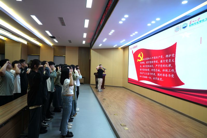 来自研究生化学工程党支部的党员代表解祥林带领新党员进行入党宣誓仪式。在庄严的党旗下,预备党员们面对党旗,高举右手,郑重宣誓。他们用最真挚的语言,表达了对党的忠诚和热爱,承诺将不忘初心使命,积极履行党员义务,为党的事业奋斗终生。