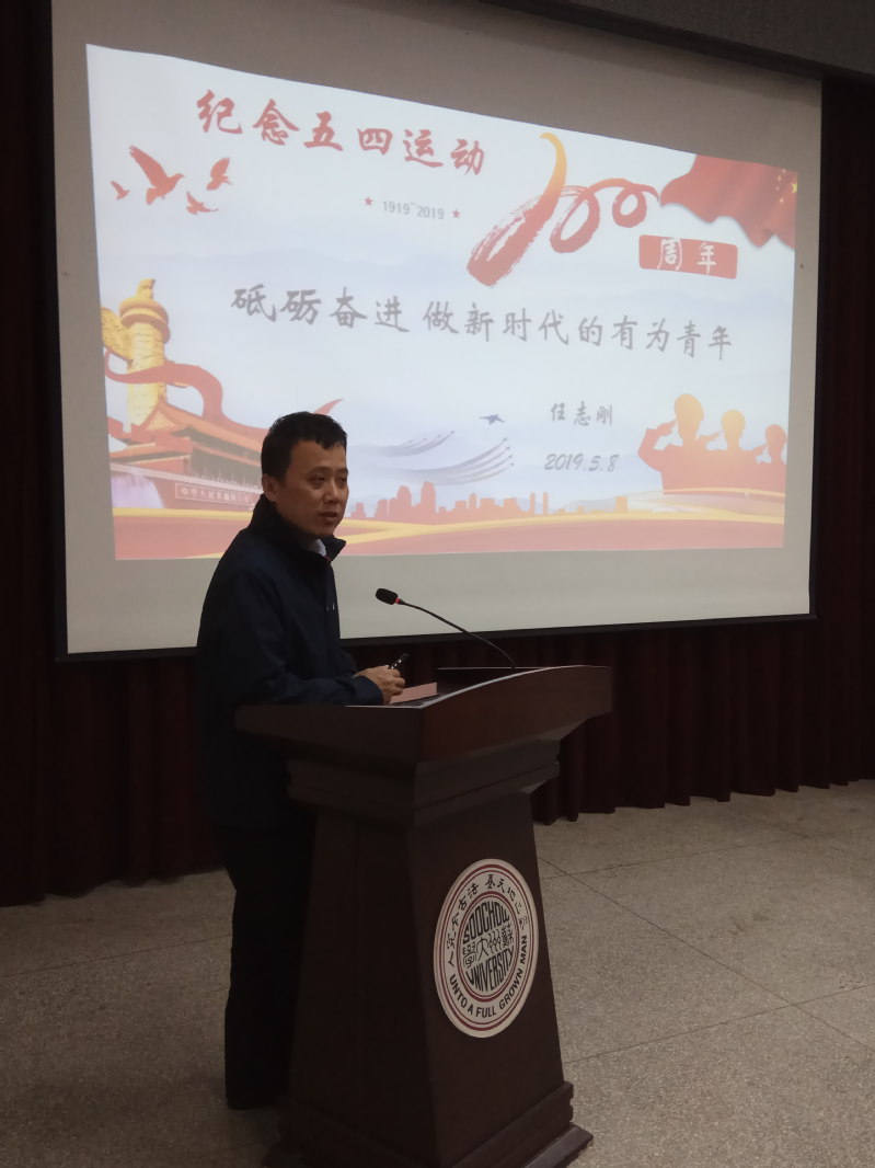 2019581230分,材料与化学化工学部分党校在独墅湖校区9071101室组织了题为《砥砺奋进,做新时代的有为青年——纪念五四运动100周年》的专题党课,学部党委组织委员任志刚老师深入浅出地讲述了五四运动和它的时代内涵
