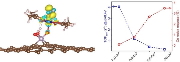 Abstract: Heterogeneous molecular cobalt (Co) sites represent one type of classical catalytic sites for electrochemical oxygen evolution reaction (OER) in alkaline solutions. There are dynamic equilibriums between Co2+, Co3+ and Co4+ states coupling with OH−/H+ interaction before and during the OER event. Since the emergence of Co2+ sites is detrimental to the OER cycle, the stabilization of high-valent Co sites to shift away from the equilibrium becomes critical and is proposed as a new strategy to enhance OER. Herein, phosphorus (P) atoms were doped into reduced graphene oxide to link molecular Co2+ acetylacetonate toward synthesizing a novel heterogeneous molecular catalyst. By increasing the oxidation states of P heteroatoms, the linked Co sites were spontaneously oxidized from 2+ to 3+ states in a KOH solution through OH− ions coupling at an open circuit condition. With excluding the Co2+ sites, the as-derived Co sites with 3+ initial states exhibited intrinsically high OER activity, validating the effectiveness of the strategy of stabilizing high valence Co sites.