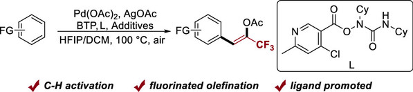 Abstract: Palladium-mediated, ligand-promoted C–H fluorinated olefination of aromatic derivatives is reported employing 2-bromo-3,3,3-trifluoropropene (BTP) as the fluorinating reagent. Bioactive compounds, such as Isatin, exhibited excellent compatibility with this reaction, underscoring the significance of this methodology for the synthesis of important derivatives.